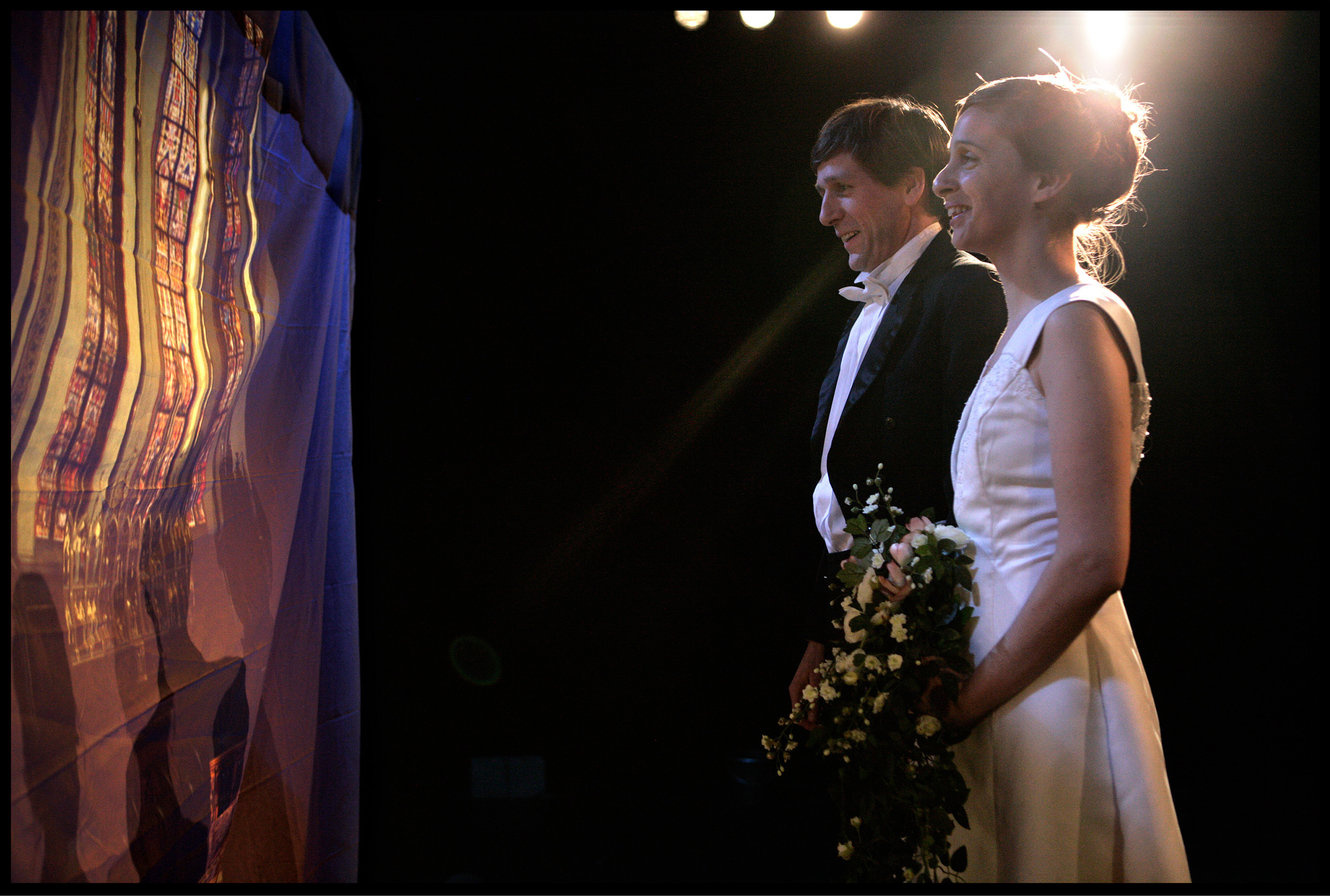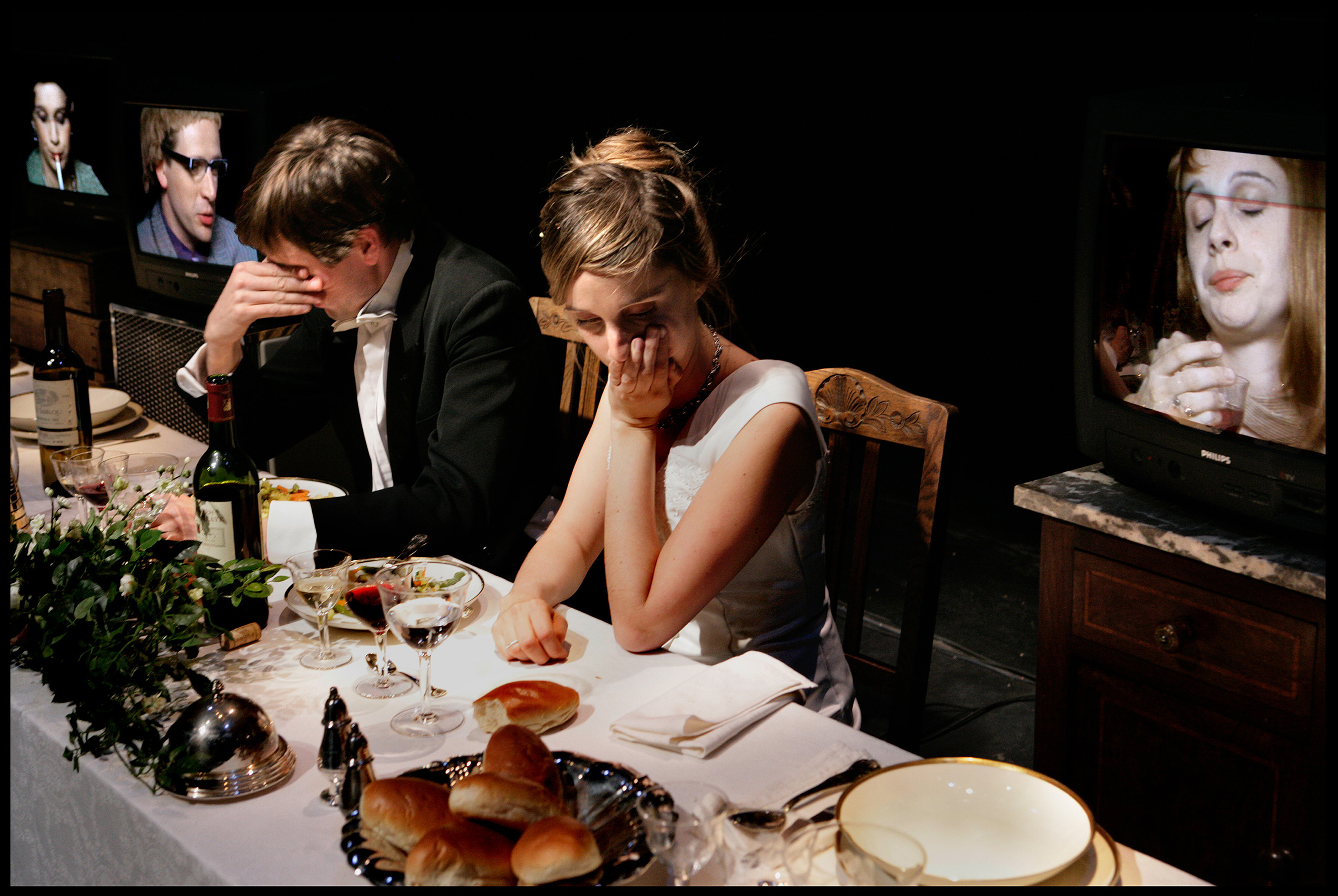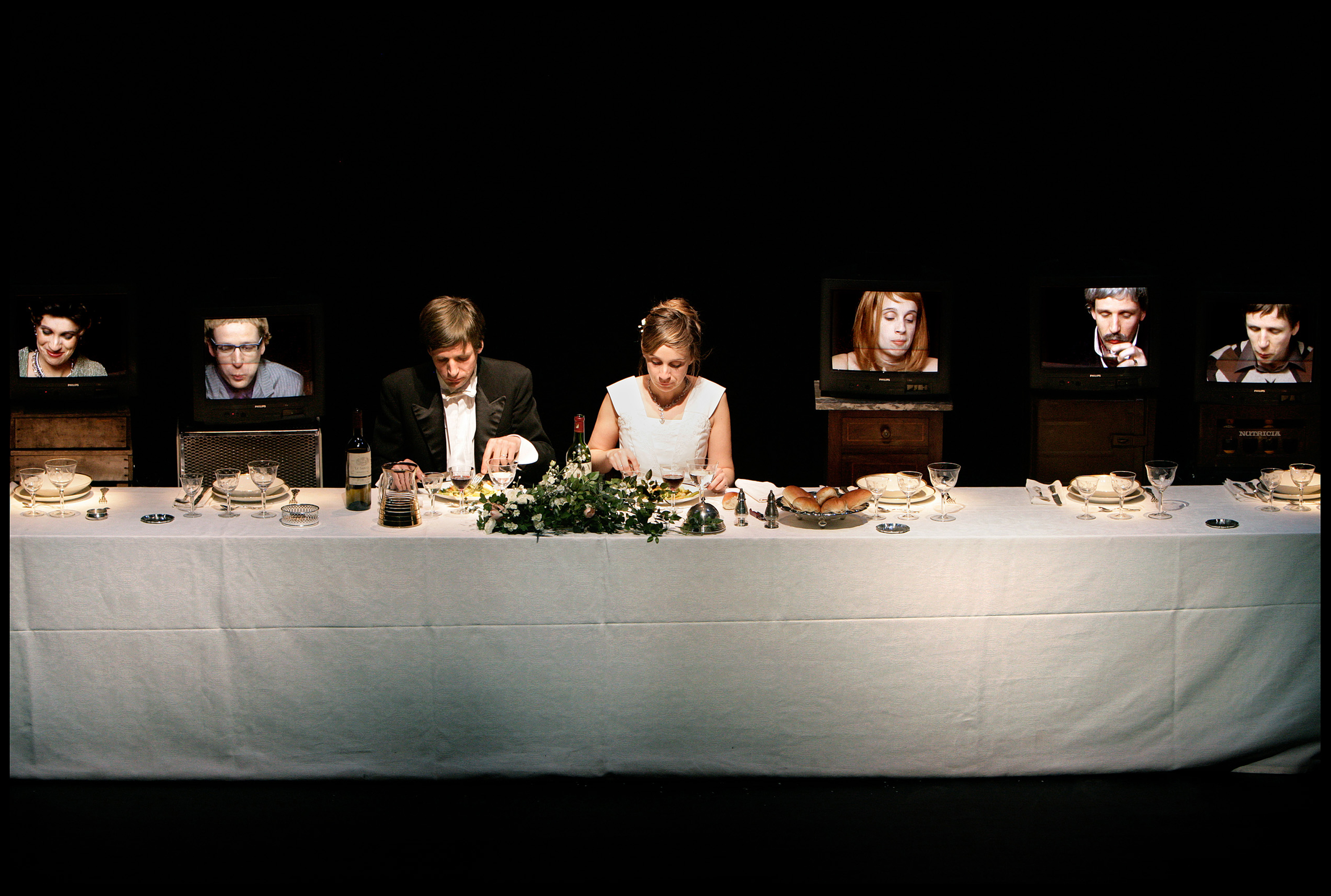 In the centre of the stage is a large decorated wedding table is. The actors/characters are sat in the middle. Sitting imposingly alongside them are seven television screens showing close-ups of their guests faces. The audience assists in a game of identity hide-and-seek in which the actors/characters struggle with their own production and enter into fierce combat with themselves. A perpetual mise en abîme, the set is at the centre of a plot with multiple layers.