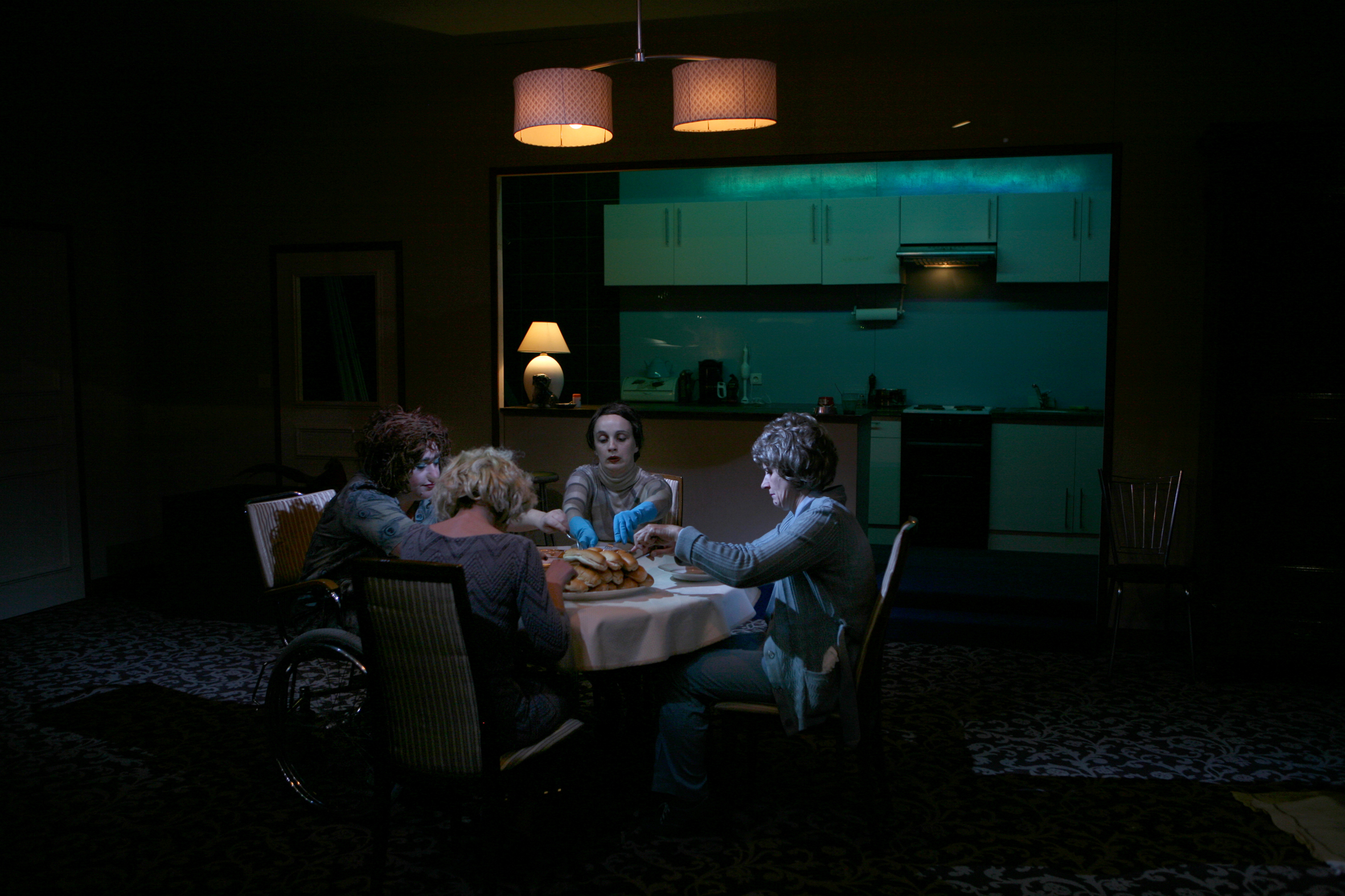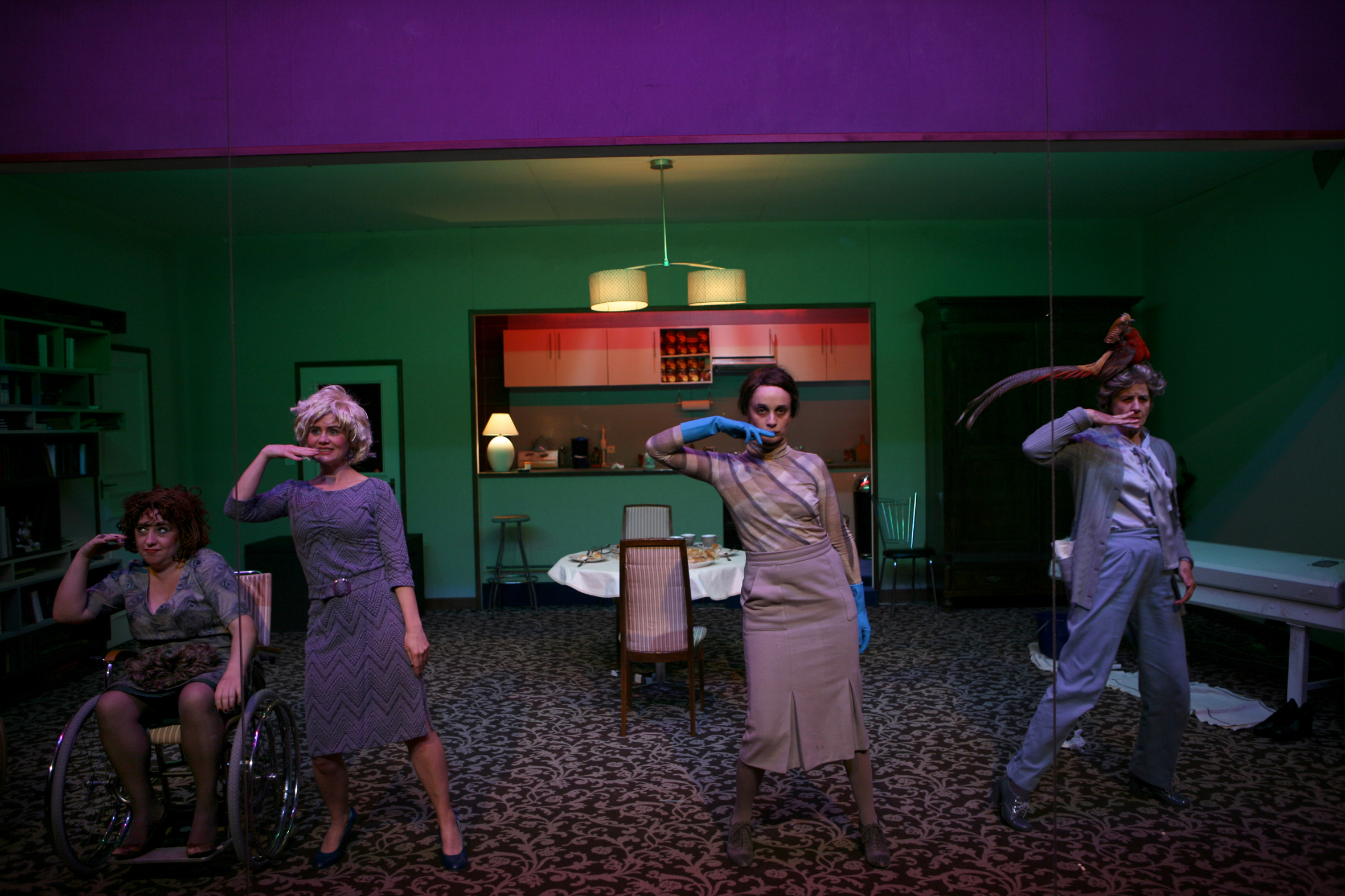 “Every time I come to see something at Vidy, it’s good!” Alright, coming out of (Self) service, this thought is flattering for the theatre by the water in Lausanne, but it is justified for the explosive new piece by the young Belgian director Anne-Cécile Vandalem. A fascinating, burlesque, morbid piece of art, (Self) service plays with sound and with meaning, and invites the audience into the intimate world of a strange family, exclusively made up of women.